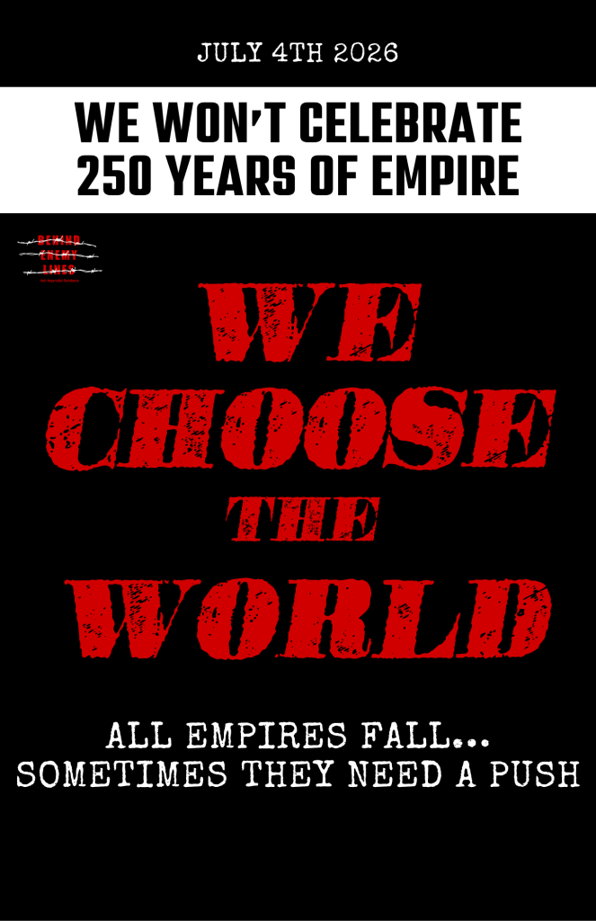 And we’re here to flip the fucking table. So, as this historic day marking 250 years of empire approaches, we refuse to participate. We refuse to pledge allegiance to this empire. The only path forward is to treat this holiday for the bloodstained day that it is, because if the greatest criminals call for celebrations, those who stand with the people of the world must declare to our brothers and sisters across the globe: WE CHOOSE THE WORLD!