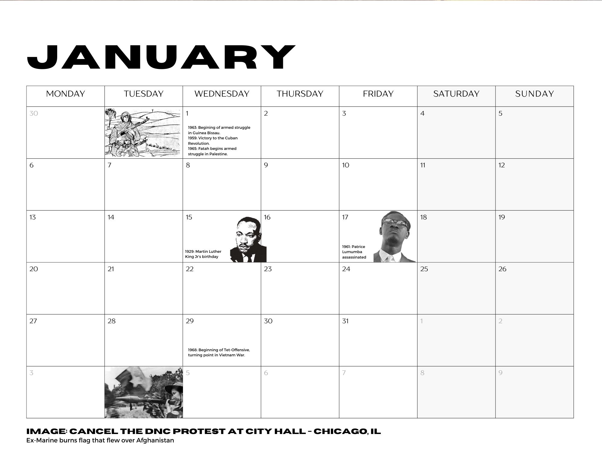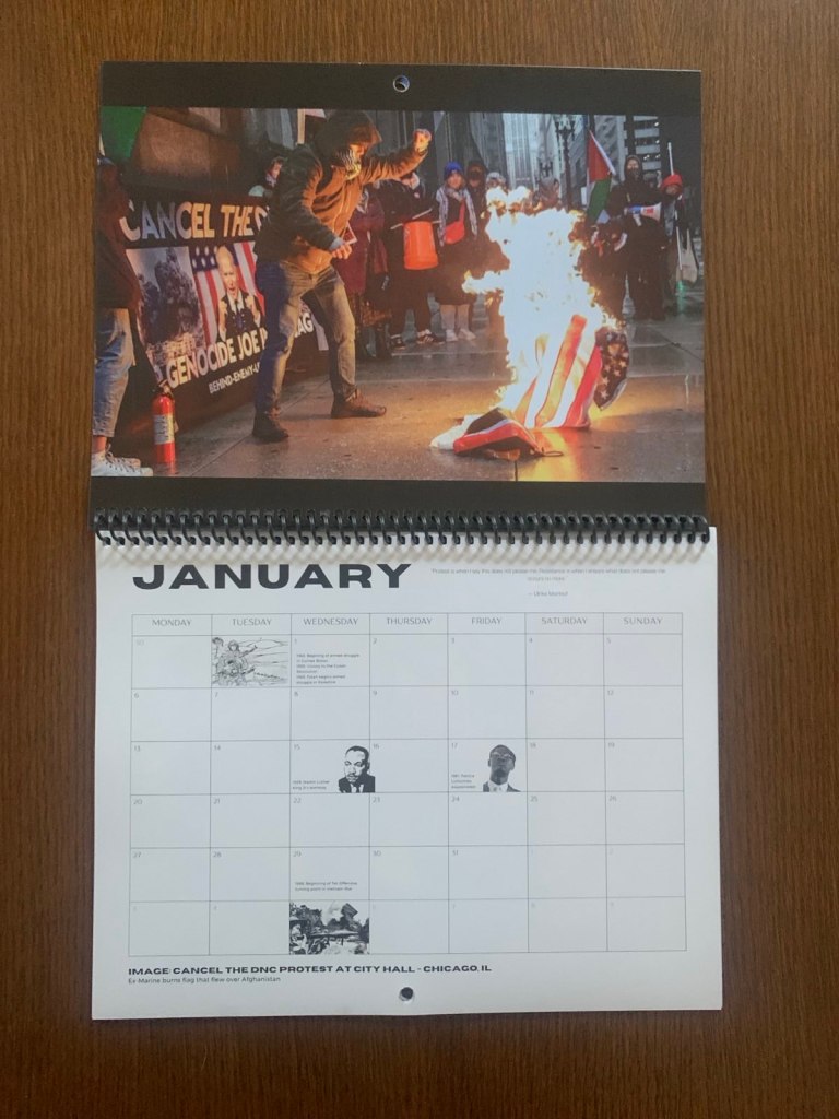 2025 calendar featuring images from Behind Enemy Lines events and highlighting key dates in resistance movements across the globe.