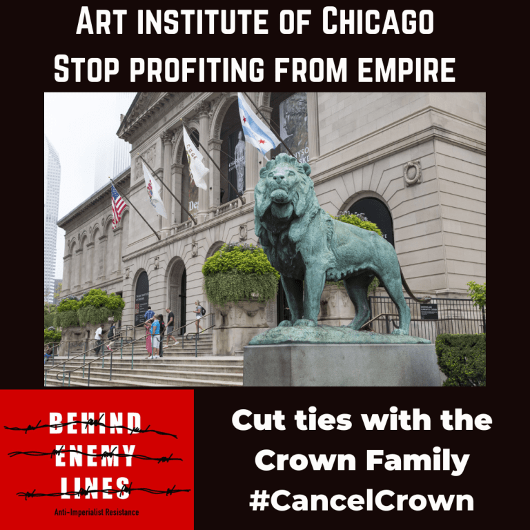 “The billionaire Crown family, philanthropic donor to Chicago institutions including the Art Institute of Chicago (AIC), has become the 34th wealthiest family in the US by directly profiting from US imperialism. The largest single source of Crown family wealth derives from the Crowns’ ownership stake in General Dynamics: the fifth largest weapons contractor in the US.”