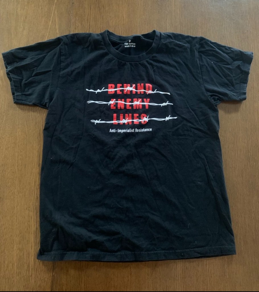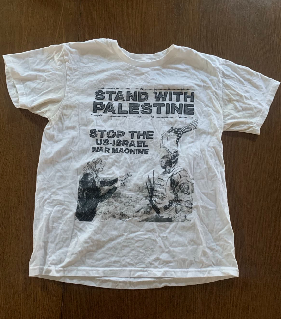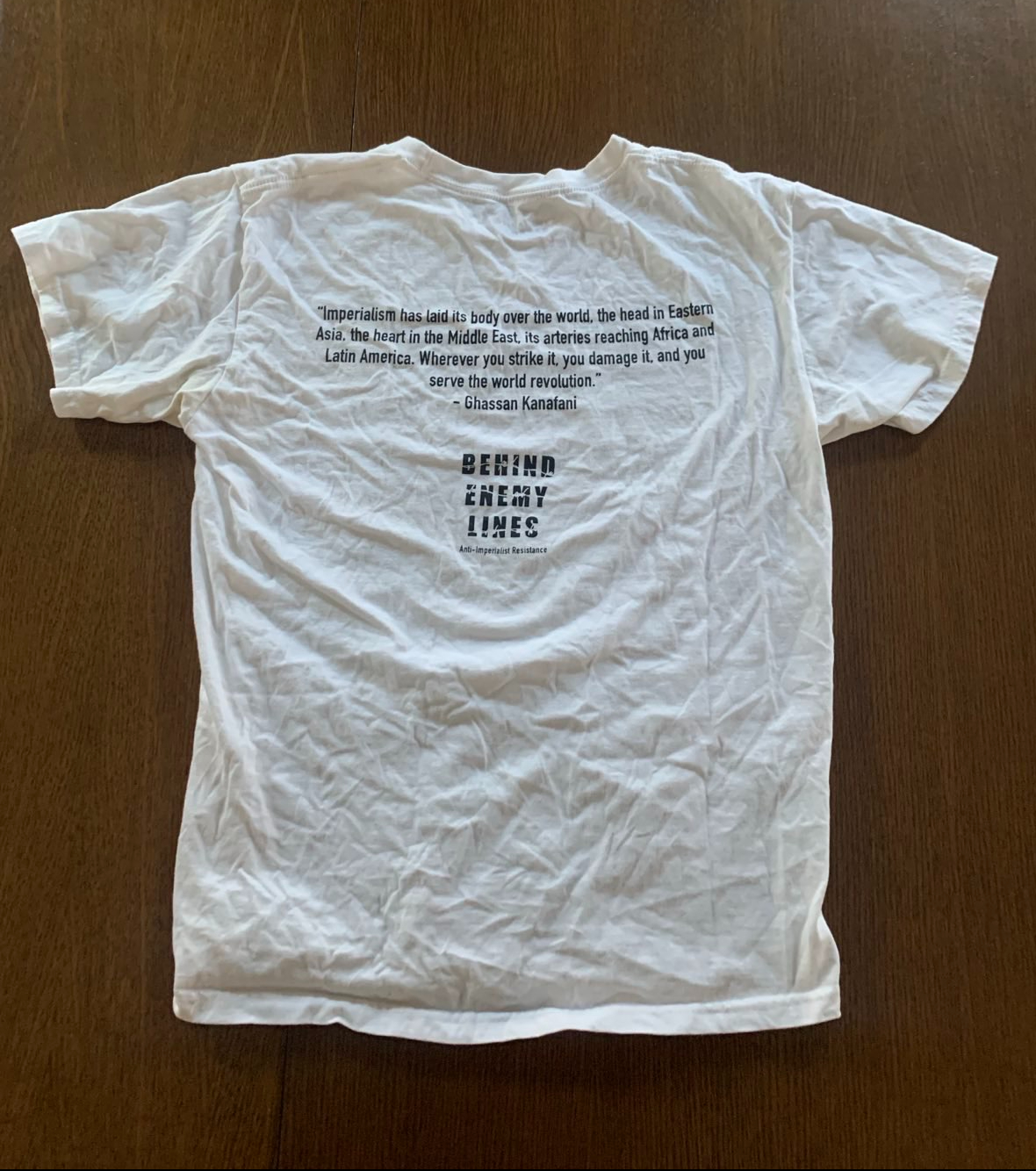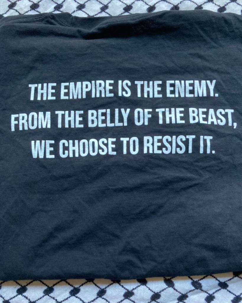 Stand With Palestine slogan and hand drawing on white shirt. The backside has a quote from Palestinian revolutionary Ghassan Kanafani: “Imperialism has laid its body over the world, the head in Eastern Asia, the
