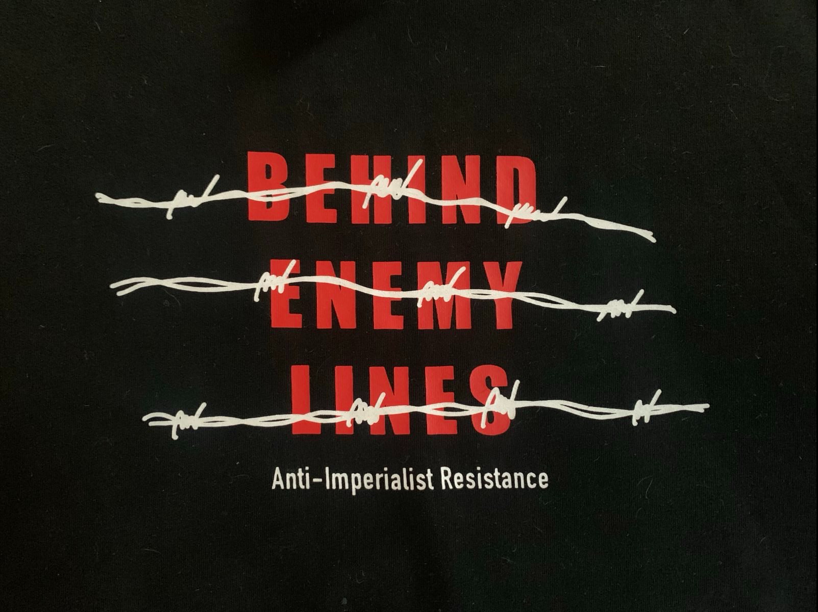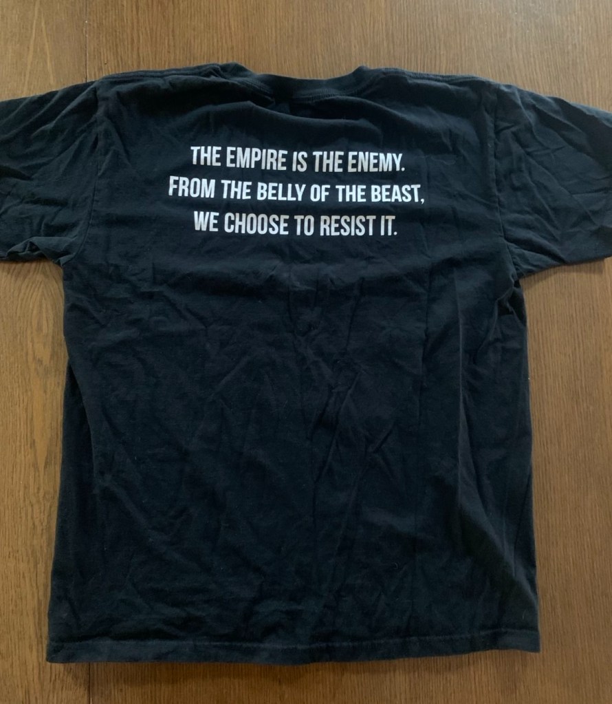 Classic BEL logo on a black shirt. The backside has our slogan: The empire is the enemy. From the belly of the beast, we choose to resist it!