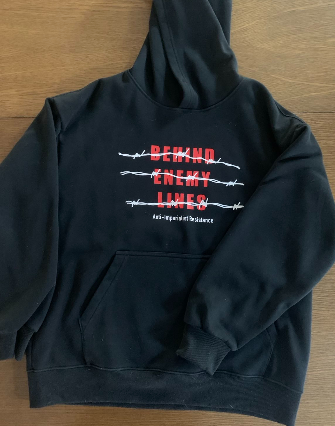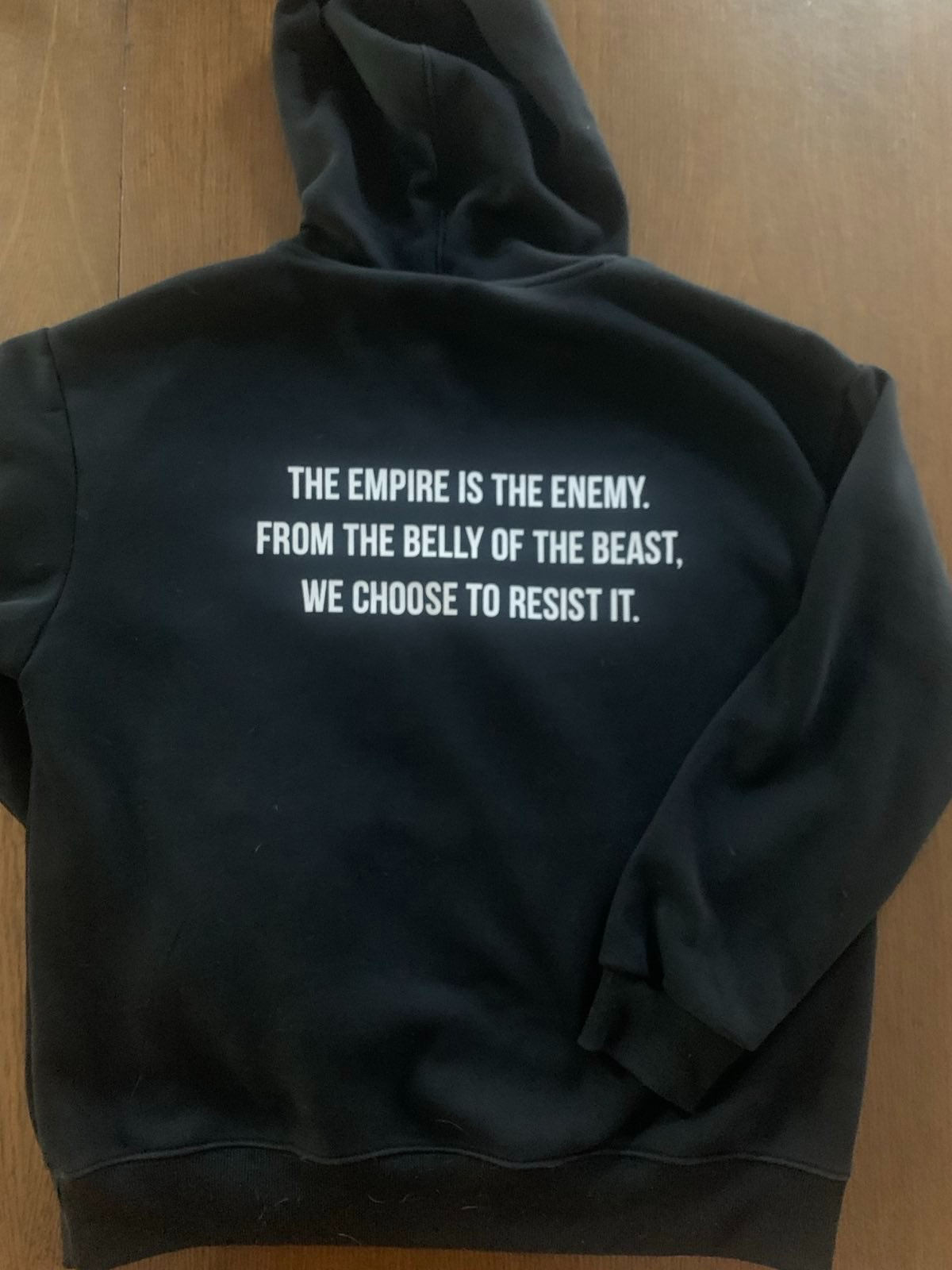 Classic BEL logo on a black hoodie with center pocket. The backside has our slogan: The empire is the enemy. From the belly of the beast, we choose to resist it!