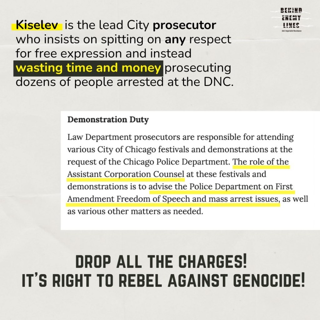 The city of Chicago is still pursuing charges for DNC protestors, led by prosecutor Marianna Kiselev. Not only are these charges meant as a deterrent for resistance but they’re a big waste of money. Aren’t you tired Marianna of showing up to court week after week with dozens of cases with no evidence? No one is guilty for protesting genocide and we’re keeping up the fight supporting resistance until the very end. It is right to rebel! Drop the charges!