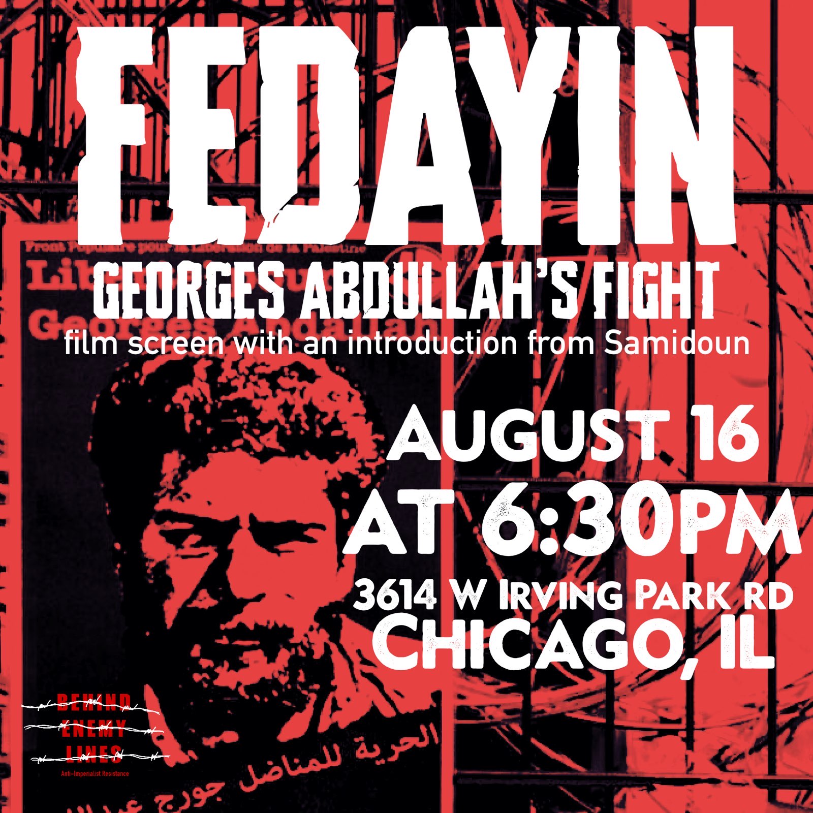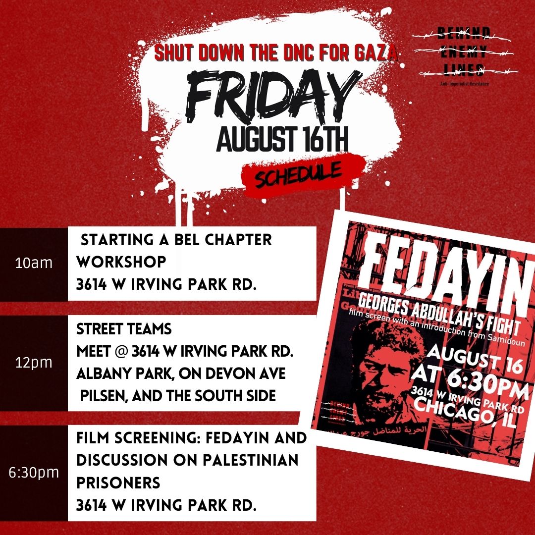 - 6:30pm Movie Screening: Fedayin and Discussion on Palestinian Prisoners – 3614 W Irving Park Rd.