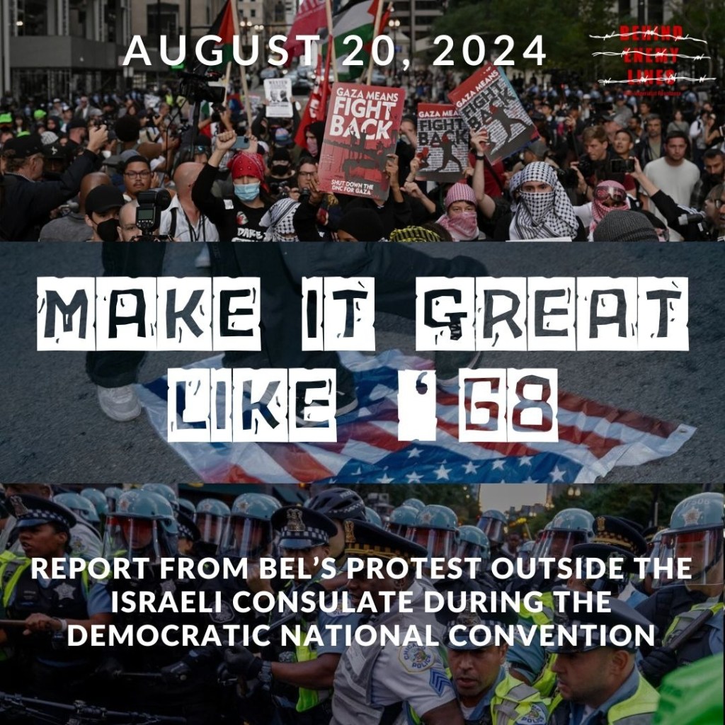 Firstly, we must continue to pursue the campaign to get the charges for all DNC protesters dropped. It doesn’t matter if you rolled with BEL on Tuesday, were arrested on a different day during the DNC, or don’t even know who we are. The state’s repression on protestors fighting the genocide must be resisted and fought in all forms. Join us in getting all the charges dropped. Call Brandon Johnson (773) 456-3191 and Kim Foxx (312) 603-1880 and demand they drop the charges for all DNC protestors.