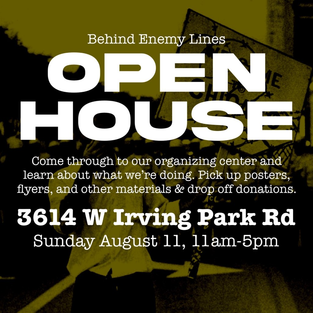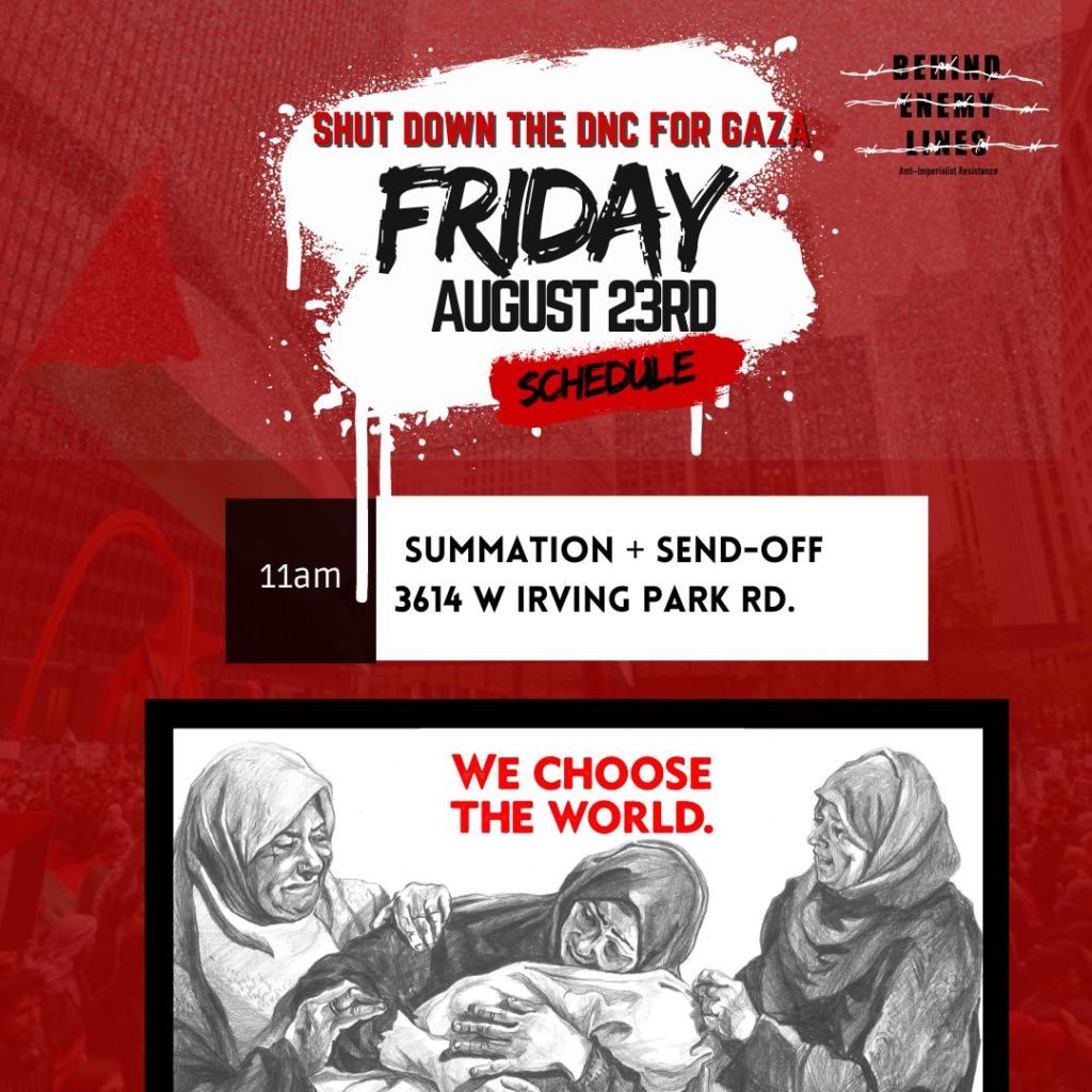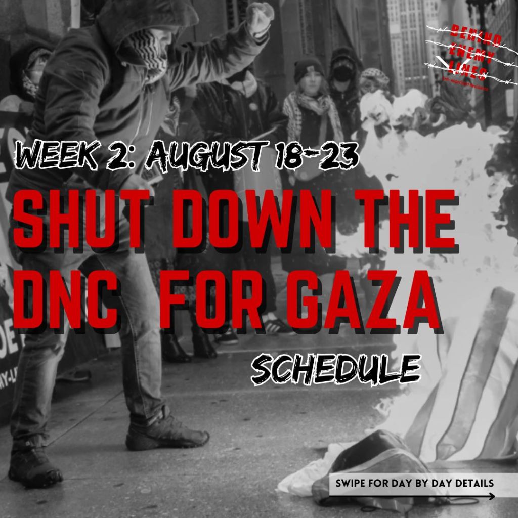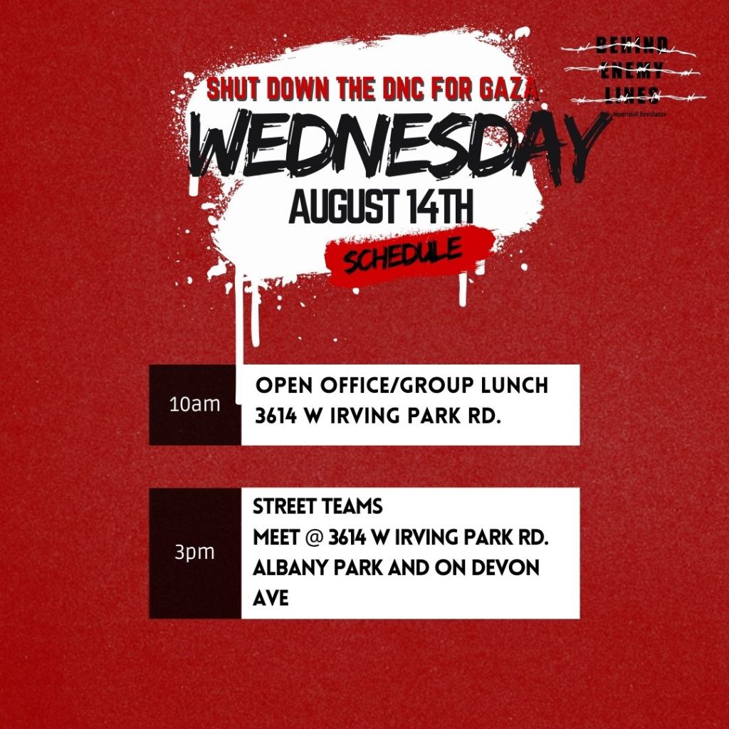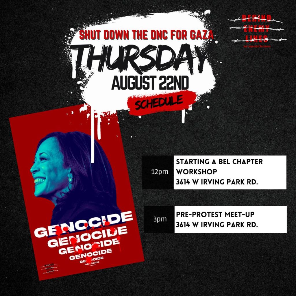 The best opportunity to do that is this August when the political party of this genocide comes to Chicago for their Death and Nakba Coronation, to celebrate Genocide Joe and crown Killer Kamala as his successor. Behind Enemy Lines is going all out to reach the people of Chicago with this message, to hold and organize neighborhood speak-outs, flood the city with posters for Palestine and against the DNC, and to bring as many people as possible to Chicago to shut down the DNC!