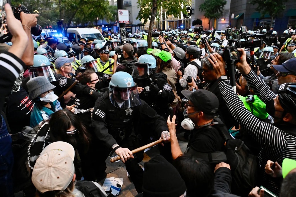 “While the criminals orchestrating that genocide were gathered less than two miles away, the CPD waged a ferocious assault on free speech. People protesting a genocide were forcefully thrown to the ground, dragged forward, kettled by the police, beaten with batons, and prevented from leaving the protest.”