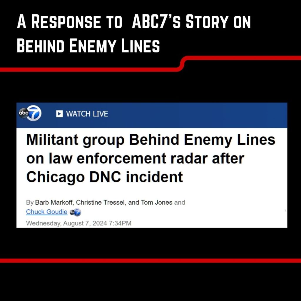 “ABC news in Chicago reported tonight, August 7th, that Behind Enemy Lines had been included in a DNC “threat assessment”. While we resent being called leftists, we’re grateful to ABC for putting together a pretty good hype video, but need to clear up the sloppy reporting and breathlessly repeated lies from law enforcement:…”