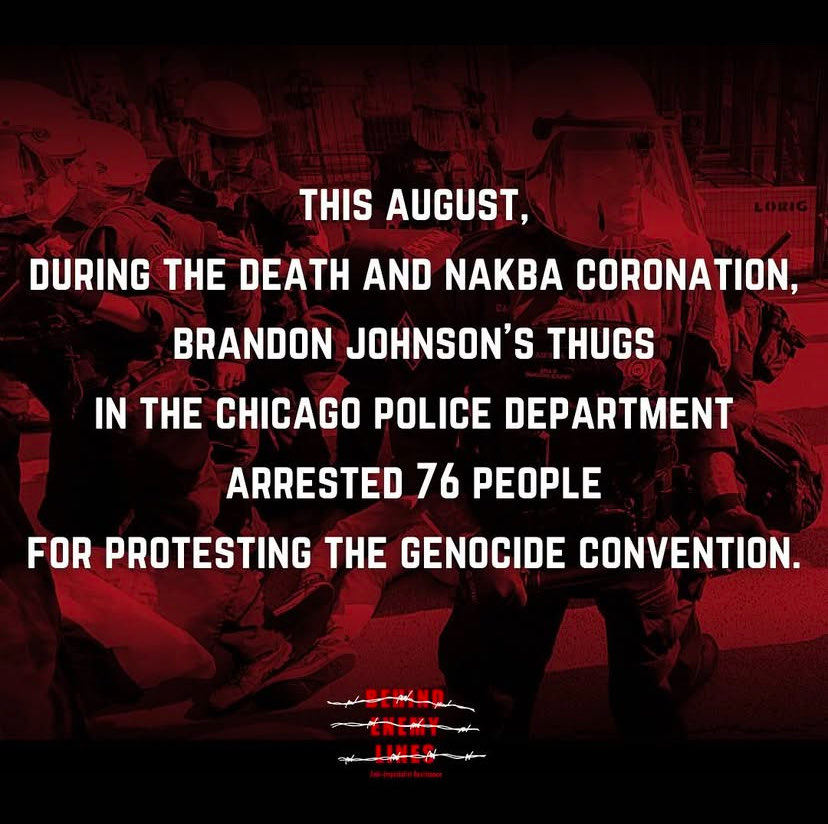 “For the five days of the Death and Nakba Coronation (DNC) Chicago Police Department Superintendent Larry Snelling supervised the intimidation, mass arrest, and beating of protesters against the genocide convention happening in Chicago.”