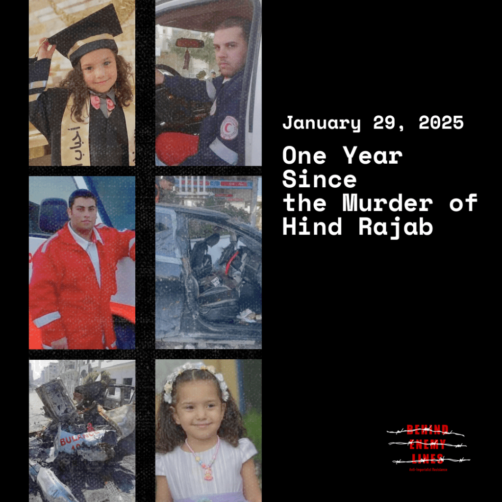 “January 29, 2024 – Tel al-Hawa, Gaza City. A day that will be remembered with grief and outrage. One year ago today, Israeli occupation forces brutally murdered six-year-old Hind Rajab, her family, and the aid workers who tried to rescue her. Hind’s desperate plea for help, captured in a haunting phone call to the Red Crescent, echoed around the world.”