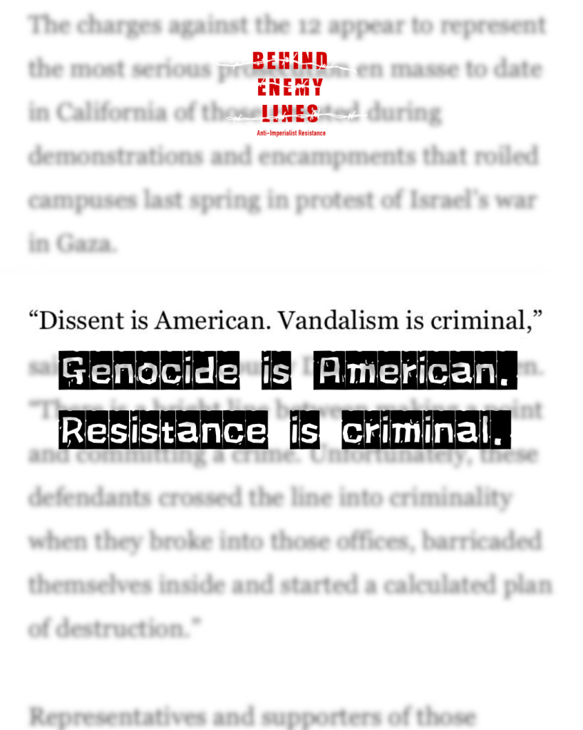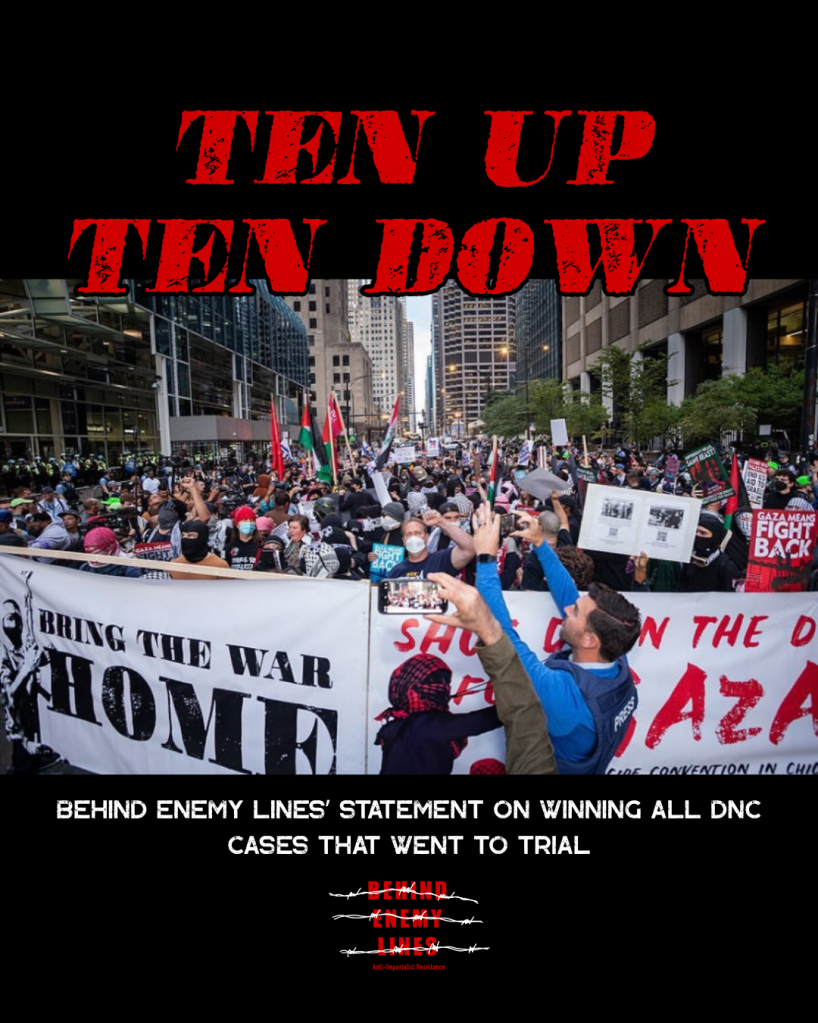 “Behind Enemy Lines and the DNC defendants were able to draw a firm line in the sand: we made it clear that the fight against repression is part and parcel of the fight for Palestine. That the courageous resisters were not going to be left to stand alone. We hope that this experience can inspire others to draw a line in the sand as well, one that is urgently needed.”