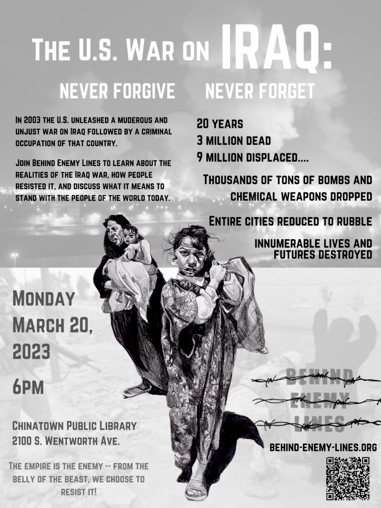 Join Behind Enemy Lines to learn about the realities of the Iraq war, how people resisted it, and discuss what it means to stand with the people of the world today.