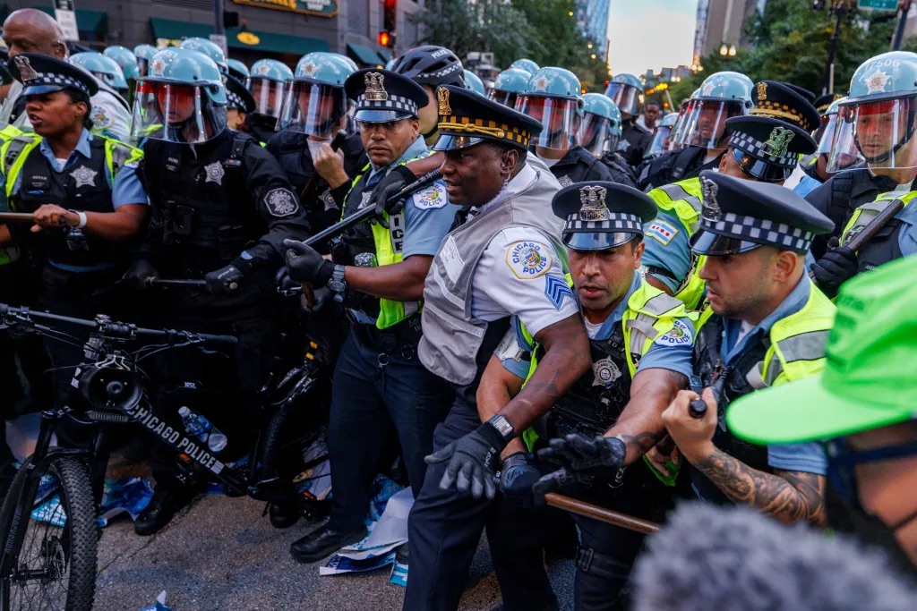 In the months leading up to the DNC, Behind Enemy Lines hit the streets of Chicago, speaking with people about what the DNC really represented and why we had to shut it down. We put out a call to action to join us before and throughout the DNC, in the fight against this celebration of genocidaires and US imperialism, to stand with the people of the world. The week before the DNC, we spent every day hitting the pavement with street teams, hosting educational events, leading trainings, and holding a day of city-wide speak-outs. When the DNC was in town, it was finally time to confront the war mongers head-on. No more pageantry. No more parades. On August 20th, we held the “Make it Great Like ’68” protest: a bold attempt to shut down the DNC for Gaza. Over 200 brave protesters joined us in front of the Israeli Consulate. But we were not alone. We were joined by hundreds of journalists and hundreds, if not a thousand, pigs, helmets on and batons at the ready1 .